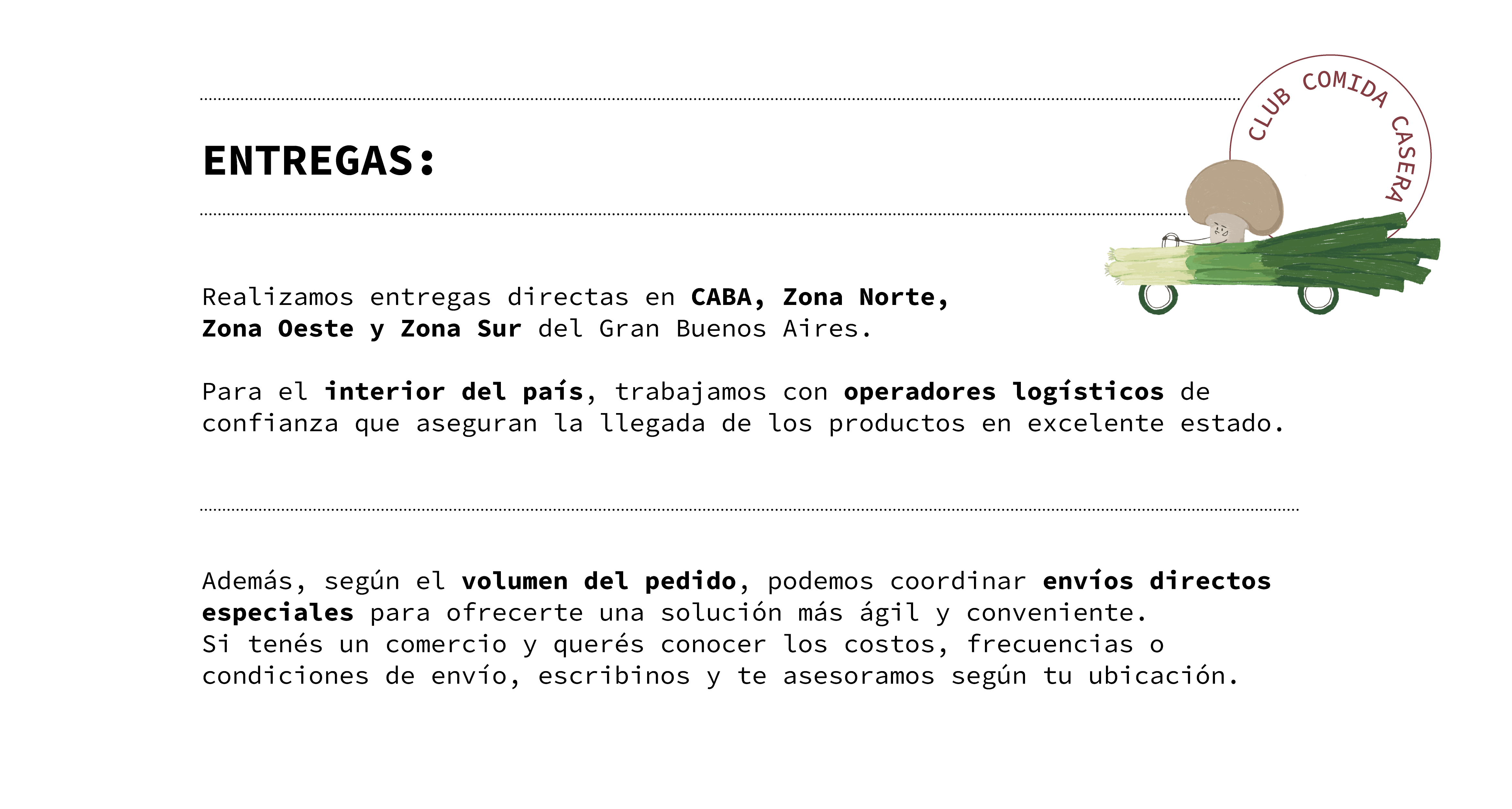 Contamos con entrega directa en CABA y GBA, y en las zonas donde no llegamos con reparto propio, operamos a través de distribuidores o coordinamos envíos especiales según el volumen y la ubicación.